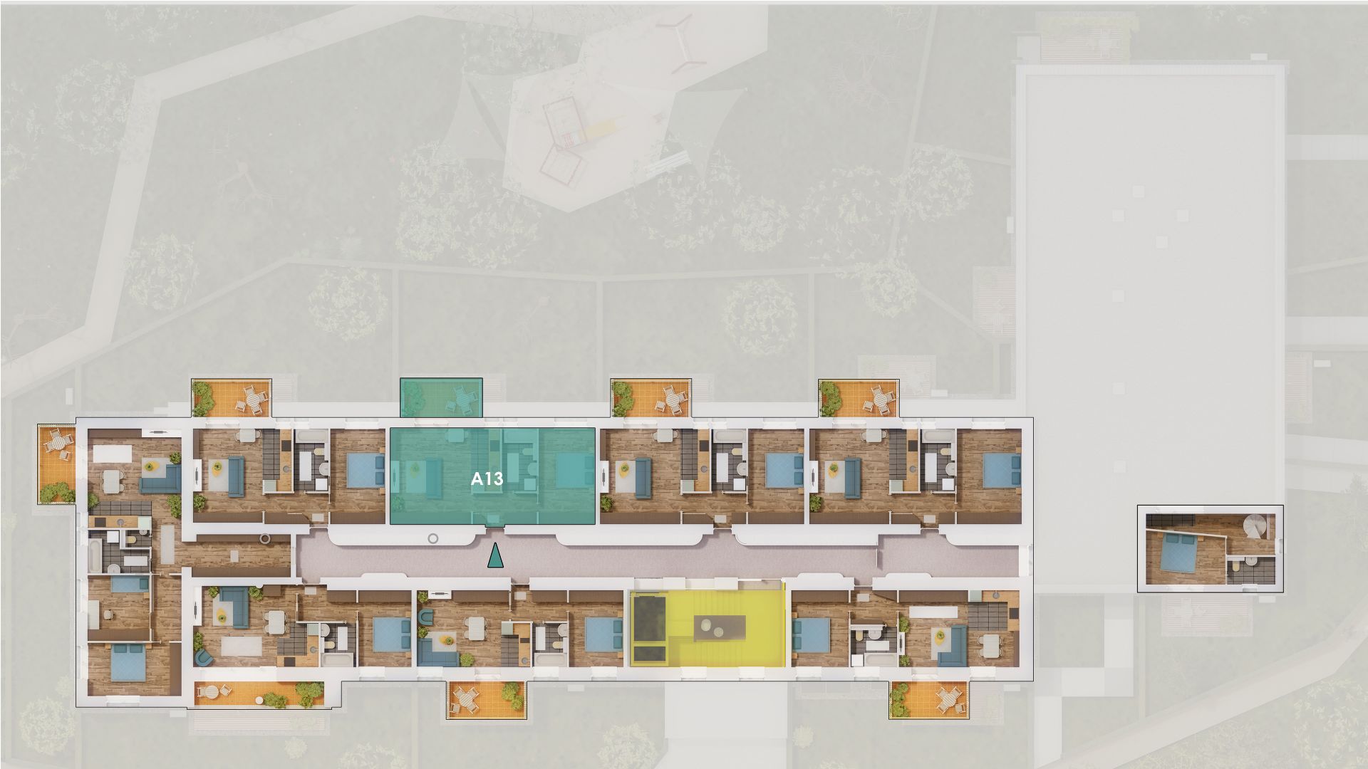 Emelet:1. emeletTájolás:NyugatAlapterület:50 m²Tároló:4,1 m²Kert:közös kertrészLoggia:7,36 m²